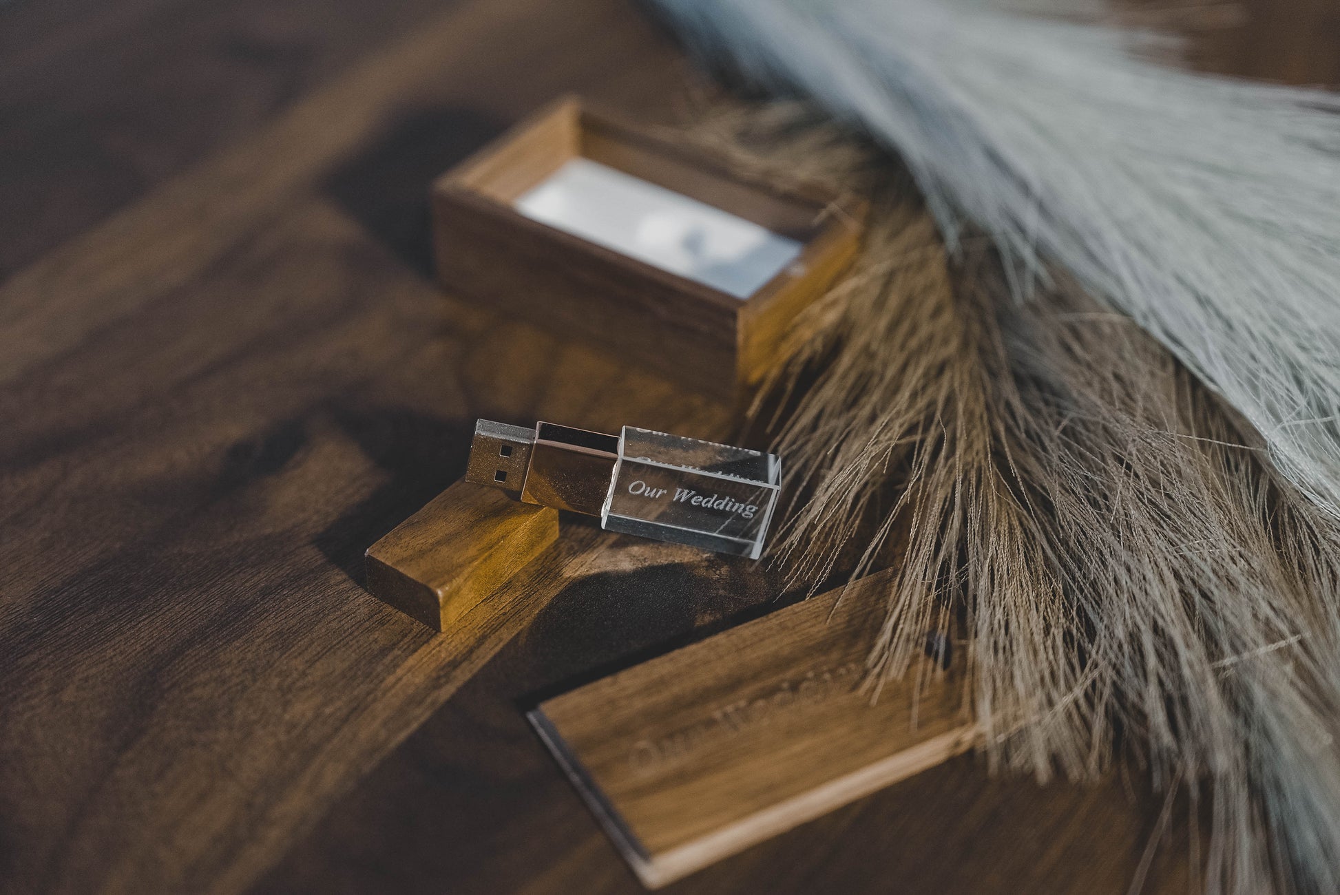 This elegant USB flash drive, engraved with “Our Wedding”, comes in a handcrafted wooden box – the perfect way to store your wedding film and photos or to gift them to your loved ones.